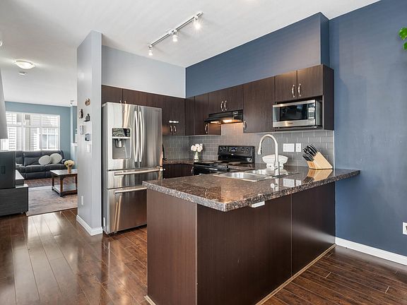 Welcome Home to "Two Blue II"! A Generous 2 bed, 2 bath, 2 covered parking, CORNER UNIT with plenty of natural light. Enjoy the Chef inspired kitchen with sit-up granite counters, stainless appliances and open to a huge dining area. This area could easily have a second sitting area too. This area opens to a HUGE WRAP AROUND DECK, floor to ceiling windows & grassy area for the pup off the main. Cozy family room with fireplace. 9" ceilings on the main. 2 beds up including, a large Primary Suite w/ 4 piece ensuite and double closets. Double Garage w/ room for a work bench & storage, Full Driveway to wash the car, FORCED AIR HEAT. Low Maintenance Fees. WALKING DISTANCE to all amenities, good schools, WILLOWBROOK MALL and FUTURE SKY TRAIN STATION!