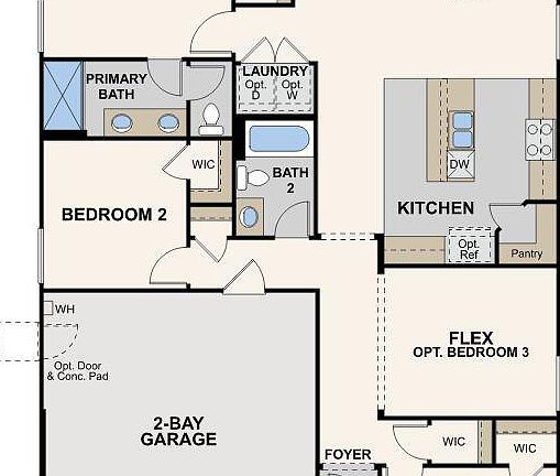The Hibiscus plan's inviting single-story layout elegantly divides private living spaces from common gathering areas. Toward the front of the home, you'll find two secondary bedrooms, a flex room, and a full hall bath. Beyond the foyer, an expansive open-concept layout includes a kitchen with a center island and corner pantry, a casual dining area, and a spacious great room. Additional highlights include a lavish primary suite with a walk-in closet and attached bath, a laundry room, a two-bay garage, and a welcoming front porch.