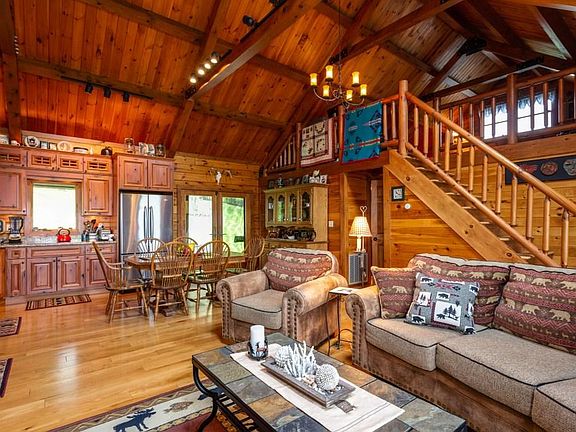 Stunning 2300+/- sq. ft. log home on 75+/- acres (5 lots)! Great for horses, hunting, livestock, & more. Kitchen with granite counters, stainless steel appliances & custom lighted rustic cherry kitchen cabinets. Great room with vaulted ceiling, skylights, & a 2-story stone propane fireplace with granite hearth & rough-cut log mantle. A full custom bath with glass surround & Corian-like counters, a laundry/mudroom, & master bedroom with walk in closet complete the main level & allow one-story living. The open loft with plenty of custom storage & stairway features custom log railings. Basement features a woodburning stove, impressive tongue in groove walls & detailed wood trim & offers a family room, bath, office area, & bonus room currently used as a bedroom. Outside, enjoy the three-story, two-car garage, an 8 ft wrap-around, covered porch with hot tub, 40x60 pole barn, a smaller 2 stall horse barn with hay storage, hayfield, fenced pasture, & a pond. Whole house generator too!
