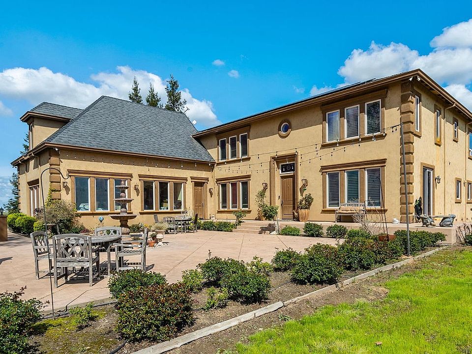 Luxurious custom home on the hill; 3535 sq ft of living space on 4.28 acres. The entire house is oriented to the vineyard, producing breathtaking 360-degree panoramic views of sweeping vineyards~located in the heart of wine country. Enter through a private shared gate & drive up to be greeted by a 150-year old beautiful Blue Oak Tree. As you enter, you'll see rustique earth slate tile flooring in the foyer, stairs, & the rest of the downstairs. The interior combines neutral tones with high ceilings and plantation-shuttered windows. It truly gives a classic rustic feel, yet modern & very comfortable country living. The living room features a vaulted ceiling with gas burning fireplace. The kitchen features concrete counters, island & wood cabinetry, black & stainless steel appliances, gas stove & double oven, & bar/sink. Large office room downstairs, half bath, laundry w/sink & additional half bath with access to pool. Upstairs features 3 bedrooms & game room(used as a bedroom). Surround system. Solar installed in 2018 and is fully paid for. The backyard is a private oasis, featuring a sparkling solar heated salt water pool built in 2020, chicken coop & space for outdoor entertaining. This is truly a spectacular property that offers both land and a large, luxurious home.