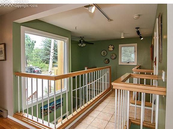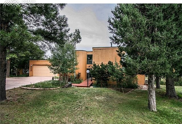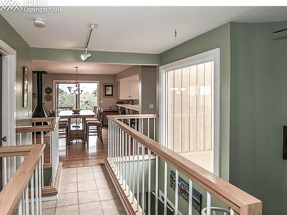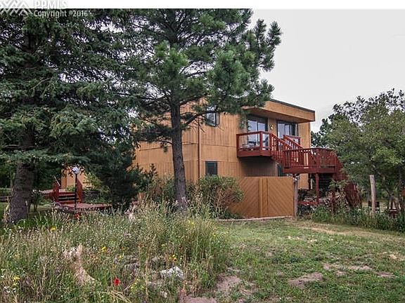 Spectacular private setting with trees and Pikes Peak views. Super cute home with open concept has the main living areas on the upper level to take advantage of the panoramic views. The sunny kitchen with pantry opens to the dining area and great room with free standing fireplace and a wall of windows. On the main level is another bedroom and second family room with built-ins. There is an additional room on this level as well as the laundry. Large deck. The property is fenced, has a storage shed, concrete drive way and is ZONED FOR HORSES. Easy commute to Denver & Colorado Springs.