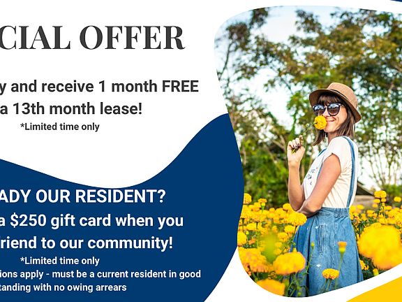 AboutThis property includes four three-storey buildings comprised of 14 bachelor units, 36 one-bedroom units and 42 two-bedroom units for a total of 92 units. The units are pet friendly and include private balcony or patio space. The property, which includes on-site laundry, bicycle storage, storage lockers and surface parking.Outdoor Parking: $95/monthStorage Lockers: $35/monthCommunity AmenitiesVideo surveillanceKeyless entryOutdoor parkingOn-site staffLaundry facilitiesStorage lockersPublic transitShopping nearbyParks nearbySchools nearbyRestaurants nearbyAbove ground parkingMajor highwaysEntertainment and sports facilitiesCoffee shops nearbyGas station nearbyBicycle storageIntercom SystemSuite AmenitiesFridgeStoveDishwasher availableBalconiesMicrowaveRadiant HeatPrivate PatioStainless Steel AppliancesUtilities IncludedHeatWater SPECIAL OFFER Apply today and receive 1 month FREE on a 13th month lease! *Limited time onlyE. & O.E. conditions apply. Promotions subject to change or be cancelled at any time without notice or penalty. Views, images, square footage, and virtual tours may be a representation of similar suites, finishes may vary. Please contact us for more information.
