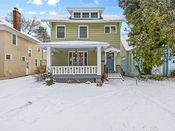 WOW! Prepare to be impressed by this thoughtfully renovated colonial home, complete with modern updates while still preserving its original character and charm. Upon entering, you'll find refinished hardwood floors, original gumwood trim, fresh paint, and all-new contemporary light fixtures throughout. The warm and inviting living room features the original fireplace and leaded-glass French doors that open to the expansive covered front porch. Off the living room is a generous dining room filled with natural light, seamlessly connected to the fully remodeled kitchen. This culinary space offers an island, brand-new custom soft-close cabinetry, solid-surface countertops, a striking tiled backsplash, luxury vinyl plank flooring, and stainless steel appliances. Adjacent to the kitchen is the updated first-floor half bath. Upstairs hosts three well-sized bedrooms, one of which includes an open balcony perfect for enjoying summer days, along with an attractively updated full bath. The third floor offers a full unfinished attic with potential to be completed for additional living space. The basement includes new epoxy flooring, Drylok-sealed walls, and all-new glass block windows. Additional updates include vinyl replacement windows throughout, a tear-off roof (2021), new garage roof (2025), hot water tank (2019), and a recently cleaned and inspected furnace (2025). Outside, you’ll find a nicely sized 2-car detached garage and a partially fenced yard. Conveniently located near the airport, U of R Hospital, University of Rochester, RIT, the 390 and 490 expressways, and approximately 5 minutes from Westgate Plaza. There’s truly nothing left to do but move in! OPEN HOUSE Saturday December 6th from 11AM-1PM. Delayed Showings Until: Thursday 12/4. Delayed Negotiations; Offers due Tuesday December 9th at 5pm.