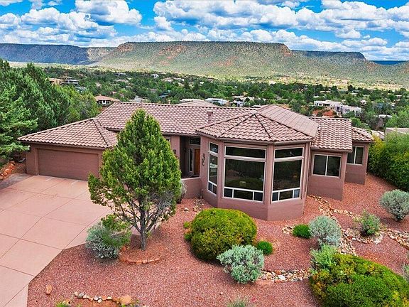 Come see this home perched atop one of the highest scenic hilltops in the Village of Oak Creek. This home has outstanding views and is located in one of Sedona's most coveted locations. This exceptional 3-bedroom residence offers the ultimate in privacy, space, and peaceful natural beauty. Surrounded by unobstructed 270-degree panoramic views, every room and patio is a front-row seat to Sedona's iconic red rock landscapes and vibrant skies. Step inside to discover a bright, open floor plan filled with natural light. Wood and tile flooring flow seamlessly throughout the home, creating a warm yet modern atmosphere perfect for both everyday living and elegant entertaining. The expansive kitchen is ideal for gathering, offering generous counter space and views that inspire. The primary suite, a true sanctuary, complete with stunning vistas to greet you morning and night. With electric sunshades, you can shield the summer sun while still enjoying great views. Multiple outdoor living areas invite you to relax and soak in Sedona's famous sunrises, sunsets, and year-round temperate weather. Enjoy tranquil mornings on the north-facing patio with majestic views of Castle Rock, Bell Rock, and Courthouse Butte, or retreat to the south-facing screened-in patio to take in the serenity of Lee Mountain and sweeping desert mesas.
