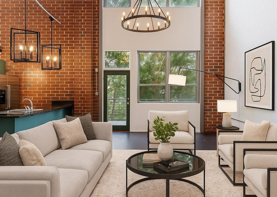 Dramatic stone islandExposed brick wallsDesigner finishesPrivate patioSpacious primary suiteFloor-to-ceiling windowsSoaking tub