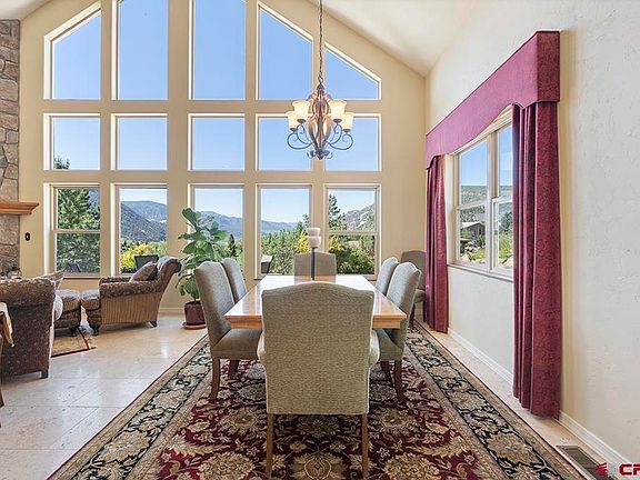 Don't miss this absolute hidden treasure on the edge of the Durango city limits, but with the feel of being tucked in the mountains with astonishing views. Carefully crafted to take full advantage of the stunning views of the North Animas Valley, Missionary Ridge, and beyond, the views from nearly every window of this home will never bore you. Located less than ten minutes from Durango's famous downtown dining and art galleries, this home has been meticulously cared-for by the original owners, and is waiting for new owners to continue the enjoyment of this beautiful home. The open floor plan invites you in, but your eye will immediately be drawn to the spectacular views to the north that can be seen from the floor to ceiling windows in the living room, which features 20' vaulted ceilings. In addition to the dramatic views that are enjoyed from the living room, there is a corner gas fireplace with a stone surround and stone hearth that will warm the chilly air of this large space in the cold weather months. Adjacent to the living room is a dining area which can accommodate a large dining table and chairs. Beyond the dining room is the kitchen which any chef would enjoy cooking in. The kitchen features granite countertops with a natural stone tile backsplash, rich, dark wood cabinetry, stainless steel appliances, a large pantry, bar seating for two, and a built-in desk. The living area, dining area, and kitchen all feature natural stone tile flooring as well. Down the hall from the living area is the spacious and luxurious primary suite. The bathroom features double vanities, a corner soaking tub and separate shower, and a walk-in closet. Rounding out the floor plan on the main level is a powder room and home office, which could also be used as a fourth bedroom. The grand staircase leads you from the main level living space to the upper level, where you will find a sitting/reading area complete with built-in storage and bookshelves, as well as a window seat. There is also a TV room or den, and two additional bedrooms and a full bath on the upper level. Once outside, you will find a multitude of outdoor living areas, all of which take advantage of varying views and sun and shade depending on the time of day. Whether enjoying a cup of morning coffee in the small sitting area at the front of the house, or an evening cocktail on the shaded back deck, you will have a hard time focusing on anything besides the view. The low maintenance Trex deck spans the front, side, and back of the home, making it almost impossible to choose which view to enjoy and whether you should sit in the sun or the shade. Fortunately, there is a view and a light to suit nearly any mood. Off of the deck is the meticulously landscaped yard. Every tree, shrub, and flower has been carefully chosen and perfectly placed, and all are kept lush during the warm weather months by an in-ground irrigation system, making the beauty of the yard easy to achieve, even if you don't have a green thumb. There is plenty of storage throughout the home, but in case you're in need of more storage, there is a three car garage plus a 200 sf storage room off the garage. This is a truly special property in an incredibly desirable location. If you're looking for views and privacy without having to compromise location, then look no further. This is the property for you!