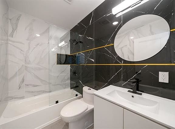 New Construction 1 bed, 1 bath with private deck at 195 Bay Street Condominiums! This 1 bedroom, 1 bathroom condo offers plenty of livable space, along with recessed lighting throughout, and dark hardwood floors. An open concept floor plan gives ample space to host a full living and dining area set. The kitchen displays lavish two-toned cabinetry with gray matte finish below and gleaming white cabinets above, quartz countertops and white subway tile backsplash, with state-of-the-art GE stainless-steel appliances. The spacious bedroom has plenty closet space and the bathroom features porcelain tile, beautiful farmhouse styled vanities with black trimmed finishes. Step right outside to your private deck/terrace area space that features a 100+ sqft. Located between Grove & Marin and surrounded by a bevy of dining options, transportation, parks, and much more! Composed of five beautifully renovated condos, amongst three stories, This boutique building is a gem that stands out from the crowd with its two-toned facade and black trimmed windows.