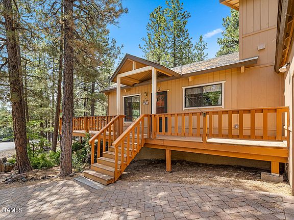 Looking for something special in Munds Park? This is the most sought after style of home in the mountains; the prow front chalet with central air conditioning. The cabin is perched up from the road allowing expansive views through the floor to ceiling wall of windows. In the great-room, your eyes are drawn to a beautiful rock faced wood burning fireplace. Look up and see the details of the T&G ceiling. Engineered oak flooring compliments the room. At 1950 square feet, this is one of the larger floor-plans offering plenty of room in the living area as well as a generous sized dining area. The kitchen is a dream with all brand new stainless appliances, an oversized walk-in pantry, lots of cabinet space and a breakfast bar that seats six comfortably. This is truly a cabin for entertaining and family gatherings. The primary bedroom is on the main level with a private Juliet balcony, walk-in closet and en-suite bathroom with shower, dual sinks and lots of counter space. Upstairs are two large bedrooms with a full bath with tub, shower and dual sinks as well. The separate laundry room is equipped with a washer, dryer and a deep wash sink. The laundry area opens to the one-plus car garage with lots of additional storage space as well as built-in cabinets. Enjoy the outdoor living space on the roomy composite wraparound deck. More features include a paver driveway and walkway, a landscaped yard and almost brand new central air conditioning and furnace.