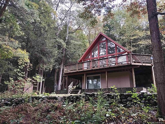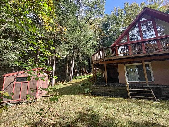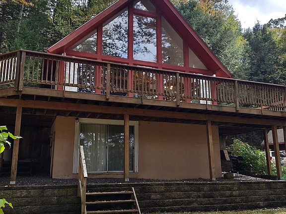 A rare sparkling Gem in the woods. Be it for your primary home or a vacation getaway this Contemporary home hidden in the woods of scenic Charlestown is a unique site. Set near the end of a town road with no neighbors to disturb wrapped by wooded hills you could not ask for a more private setting that belies the lot size! It is nestled on a flat yard surrounded by steep wooded hills that give you privacy galore without a matching tax bill! You would never guess that the homesite is a short walk to the town center and even closer walk to the town Olympic sized pool for a hot summer days fun for you and your guests. Hike, bike, hunt, X-C ski and snowshoe at the State Forrest with trails starting a couple of hundred feet away. Or spend the day on the water boating and fishing from the town Boat launch less than a mile away. In the winter snowmobile or ski at Okemo and Sunapee, each about 20 miles drive! Keene and Claremont are just 30 minute's away and Suburban Boston is about a two hours drive. Watch sunsets sitting on the deck or in the large vaulted Livingroom with a flickering fire taking the chill off from the propane fired gas woodstove. the home features two Baths ,two bedrooms on the main floor and a loft bedroom overlooking the vaulted Livingroom. Add to this a detached 2 car garage to store your toys and a finished, walk out, lower family room and this home home will accommodate your crew and guests too! Come and see this rare affordable find for yourself!
