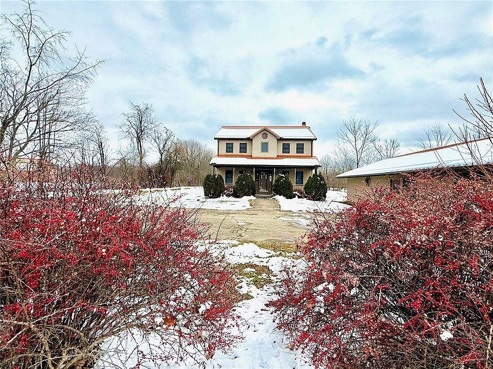 Modern 2-Story Home with Bonus Building — Just Minutes from Cranberry! Country living while only 4 miles from Cranberry’s Shops and Restaurants. This thoughtfully constructed home features a Welcoming 2-story Entryway and a Semi-Open layout that feels Spacious and Bright. The Eat-in Kitchen offers Panoramic views through a Bay Window, while the Cozy Family Room centers around a Wood-Burning Fireplace—perfect for chilly evenings. The Principal Suite includes a Dual-Sink Vanity, Jetted tub, and Generous closet space. 48' x 24' Bonus Building, ideal for use as a Guest House, Workshop, Hobby Space, or Additional Garage—with its own Full Bath. New Maintenance-Free Metal Roofing and Built with 2x6 and 2x12 framing, this home has Quality throughout. Quick Access to I-79, PA Turnpike, & 30 Mins to Downtown Pgh.