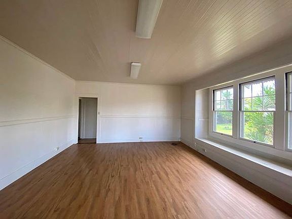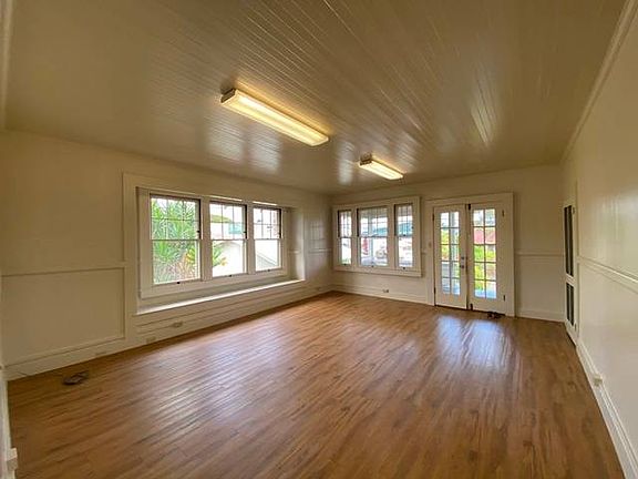Charming home with detached two-car carport on side side by side lots nestled in the heart of Hilo town. Rock wall and cement front steps lead up to the front porch. Rustic double screen and front entry doors with glass panel windows. High ceilings and newer vinyl flooring throughout upstairs living area. Built in storage space located under living room window seating areas. Sash cord windows hold the memories of that country home feeling. Wood kitchen cabinets with a one piece stainless steel sink. Interior stairwell lead to HUGE basement where solar water heater and circuit breaker panel is located. Two exits downstairs that goes out to backyard with laundry line and side of home. With cement floors, use the downstairs for additional storage space or workshop.