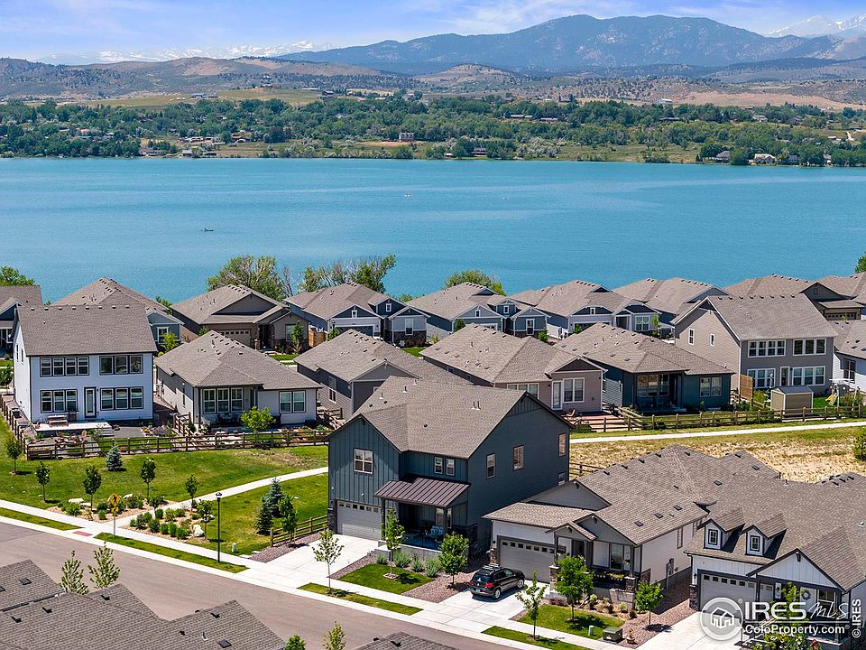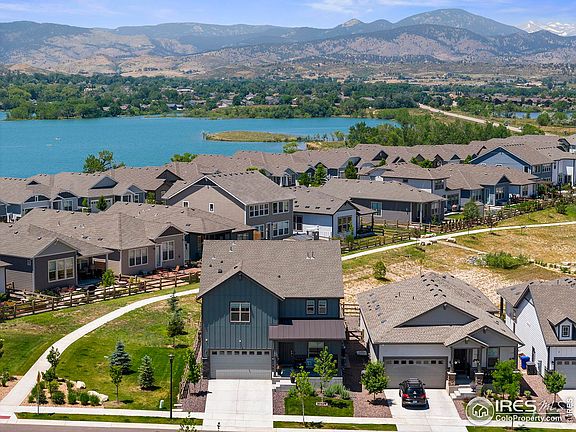 Have you ever dreamed of waking up to beautiful foothill views? Here is your chance! This gorgeous home, built in 2022, combines modern finishes with inspiring scenery in a convenient location siding and backing to neighborhood green space. The appeal is immediate with the lot location creating privacy outside along with outdoor adventures just a block away to paddle board, kayak, canoe, and fish! The inside is just as wonderful with the open concept floor plan featuring four bedrooms + study, three and a half bathrooms, and over 3000 finished square feet. Natural light pours through high ceilings, highlighting the many upgrades such as motorized shades, extended hardwood floors, granite counters, subway tile backsplash, double ovens, and mountain views. The living room is perfect for cozy gatherings around the elegant gas fireplace with tile trim, while the kitchen shines with modern appliances, soft-close cabinets and drawers, and under-counter lighting. The spacious primary suite invites relaxation with a spa-like bath, luxurious granite countertops, a frameless glass shower door, 2 separate sinks and vanities, and a rejuvenating soaking tub. Outside, the delightful backyard offers your private oasis with stunning mountain views. The covered patio, complete with a gas line for the grill, is ideal for entertaining, and the large grass lawn provides plenty of space for play. The finished basement expands your living options and entertaining possibilities. With Boedecker Lake just a stone's throw away, Mariana Butte Golf Course less than a mile away, and numerous hiking and biking trails nearby, recreation is always within reach. Plus, with schools, shopping, and dining spots close by, daily living is effortlessly convenient. Discover the quintessential Colorado living experience at 195 Lake Park Drive.