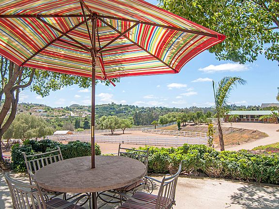 Tucked away at the end of a peaceful, quiet cul-de-sac, this south facing Equestrian Estate on 3.36 acres built by top local builder, Mark Kirk is spacious and unique. From a great vantage point overlooking the grounds with incredible views of the valley, see your horses from almost every window. 1st floor Mstr, 2 family rooms, 3 car garage, gated entry/security system, lots of windows and skylights. 2 custom barns(6 total stalls) 3 well-water irrigated pastures, 40 Avocado & 25 Fruit Trees. See supplmt:Open foyer with spiral staircase and beautiful chandelier, Master BD suite w his/hers dressing and closets. Great details such as family room with brick archway and fireplace, 6 speaker surround sound, central vacuum, elegant formal dining with coved ceiling, kitchen with island, counter bar and breakfast nook, ceiling fans in all rooms, dual heating and dual air conditioning systems. Huge upstairs Family/Game Room with fireplace, another surround sound system, built in wet bar w wine rack, fridge, 2 balconies with a BD and full BA on the same level. Maid's or Manager's quarters with kitchenette, Murphy bed, full bath and separate entrance. Light and bright with windows everywhere! Great equestrian improvements include pastures, stalls built by Custom Equine Design and fully fenced with a track around the property. Plenty of room to add an arena, recent quote available. Excellent Well with 5,000 gal. storage tank, and water quality suitable for healthy avocados. Property irrigated with two 12 station "Rain Dial" systems to supply the landscaping, grove and to make your pastures green! House on municipal water. Second service entrance. Plans for a matching 600 SF Casita available. Kubota tractor, Husquavarna sit down mower, and some other equipment convey! This property shows incredible pride of ownership, it's a must see!