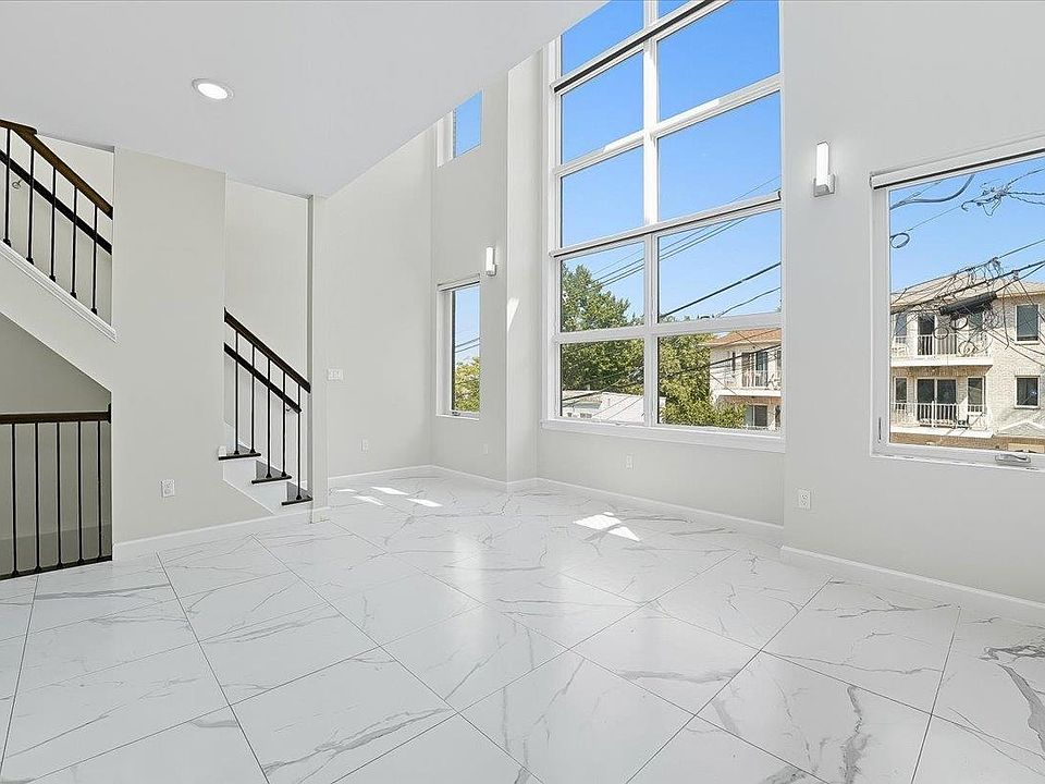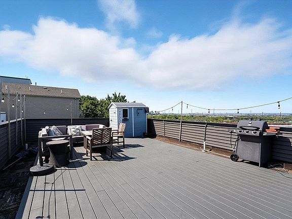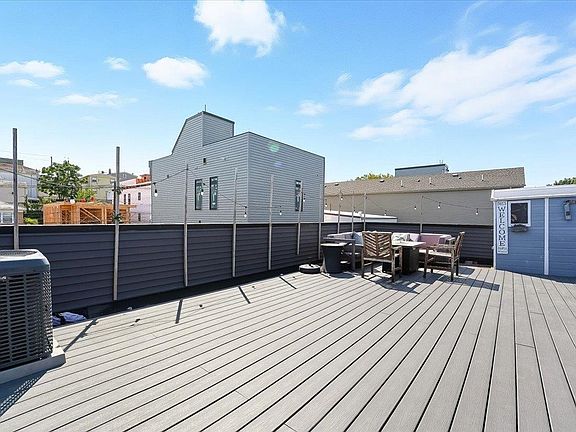 Welcome to 195 Lincoln Street, Apt 2 a sprawling, light-filled 3-bedroom, 2.5-bathroom home in the heart of Jersey City Heights. This expansive top-floor residence is defined by soaring ceilings and floor-to-ceiling windows that flood the space with natural light. A private roof deck, complete with outdoor furniture, offers the perfect escape for relaxing or entertaining with sweeping city views. Inside, the open-concept kitchen and dining area features sleek quartz countertops, high-end appliances, and a spacious island with pendant lighting. Just above, a lofted living area provides a versatile second lounge, den, or family room. Upstairs, you'll find two spacious full bathrooms serving the bedrooms, including a primary suite with an en-suite bath and fully fitted generous closet space. On the main kitchen level, a stylish powder room adds extra convenience for guests. A Murphy bed is also included, making one of the bedrooms ideal for flexible use of space. This home comes with tandem parking for two cars (shared with the downstairs neighbor) a rare luxury in Jersey City and an installed EV/Tesla charger for added convenience. Nestled in a quiet neighborhood, you'll enjoy both privacy and easy access to NJ Transit buses and major highways for a simple commute. Available ASAP 195 Lincoln offers an unbeatable blend of size, style, and outdoor living!
