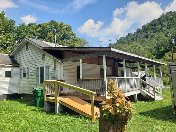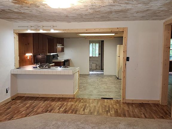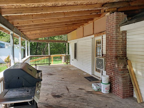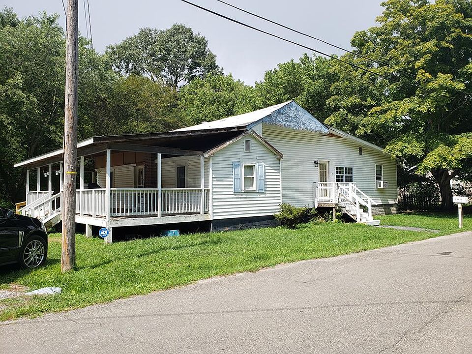 Complete the renovation and make this home your own! Sit on this spacious front porch and enjoy your morning coffee or have a large family gathering! Loads of potential in this 1800 + sq ft home, 2-4 bedrooms (2 rooms would require closets to qualify as bedrooms), 2nd bath has not been completed. Per seller: new kitchen counters, new range hood, newer lighting, newer door trim & drywall, new carpet, new laminate, new security system, new plumbing, newer windows in part of the house, new electric furnace in basement, newer rolled roofing, electric has been updated. Original hardwood in some rooms. Large pantry off the kitchen could be completed. Kitchen could be extended into the current laundry room for an eat in kitchen. Add sliding door and overlook the back yard and creek while you eat. Large office space off the kitchen/great room. Large attic space could be renovated for extra living space. Handicapped ramp on the far end of the porch. 3 window a/c units (1 is also a heater).