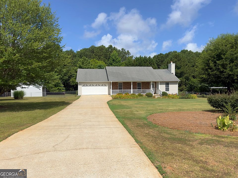 This 3-bedroom, 2-bathroom spacious ranch, nestled on a beautifully manicured large level lot with a fenced backyard, offers a perfect blend of comfort and outdoor enjoyment. A charming covered rocking chair front porch and an expansive covered back deck with ceiling fans allow you to relax and take in the serene surroundings year-round. The deck overlooks a large fenced yard, ideal for outdoor activities, entertaining, or starting your own garden. A handy shed provides convenient storage for gardening tools and lawn equipment. In addition to the attached 2-car garage, a large detached garage offers even more storage or an extra covered parking space. Inside, the living area is warm and inviting, with engineered wood flooring, cathedral ceilings, and a cozy fireplace with gas logs. The open floor plan leads into a kitchen equipped with a pantry, ample cabinet space, stunning solid surface countertops, and a stylish tile backsplash. The kitchen features a complete stainless steel appliance package, including a French door refrigerator, dishwasher, under-cabinet microwave, and a gas convection oven. The master suite is a true retreat, featuring a tray ceiling, a spacious walk-in closet, and a renovated master bath with low-flow plumbing fixtures, a tall double vanity with solid surface countertops, and a beautiful tile shower with a seat. Two generously sized secondary bedrooms, along with an updated second full bath, complete the home. The second bath features solid surface countertops and a tile floor. A conveniently located large laundry closet sits in the hallway adjacent to all bedrooms. Custom 2-inch wood blinds adorn the windows throughout the home. Located just minutes from shopping and with easy access to I-75, this home is a must-see! Don't wait-schedule your showing today, as this one won't last long!
