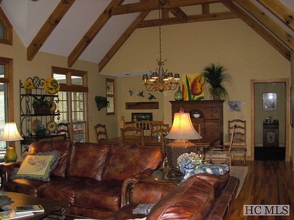 Everything about this home is spacious and generous with loads of room for everyone and everything! The Great Room boasts high beamed ceilings with a wood burning fireplace and the kitchen is open and bright with generous cabinet and counter space. Wood floors run throughout the main living area. The lower level features a second great room with full bar and wood burning fireplace. And those porches! The upstairs porch is screened and runs the entire length of the house. Great for protected outside dining, entertaining or just relaxing and enjoying the view. There's also a porch running the length of the lower level. Spacious 2 car garage with golf cart garage as well. Owners have just opened up a great mountain view. Mature landscaping finishes the package. Terrific value for the size and location.