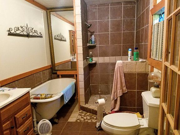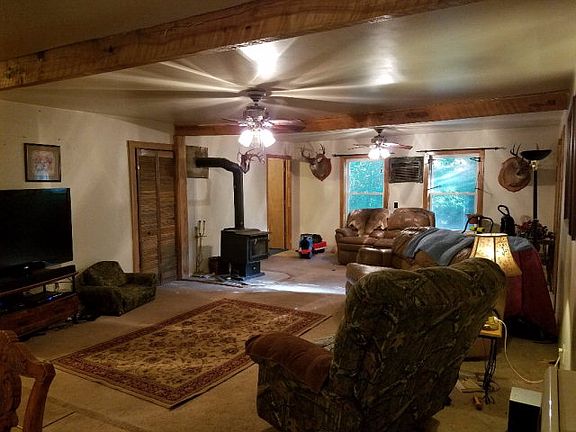 Your lodge in the woods awaits! Needs a few finishing touches to add icing to the cake! 5 Bdrm/2 Bath home with 9.6 acres, a handy 18'x32' shop with concrete slab floor and electricity, a chicken coop, a barn, and a couple small sheds. Long driveway gets you the privacy you want. Wooded with a couple clearings (great for gardening or keeping a horse happy). Home comes with 2 natural gas wall heaters, a wood stove, and a dishwasher. In the master, you'll enjoy the tiled walk-in shower and claw-foot soaker tub. Open floor plan, plenty of room for family and guests, plus a partial basement (inside and outside entrance). Relaxation on the front porch is a must!