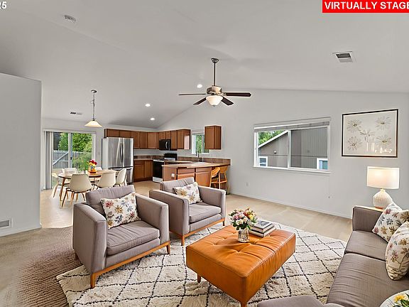 Located at the end of The Rolling Hills, this three-bedroom, two-bath home sits in a quiet, well-kept neighborhood. The interior has just been professionally cleaned and offers a practical, easy-to-live-in layout with vaulted ceilings and good natural light. The kitchen includes stainless steel appliances, a Samsung refrigerator, and a Maytag dishwasher. You'll appreciate plenty of counter space and an open connection to the dining area. The laundry room comes with a washer and dryer included, so that you can move right in without extra setup! The attached two-car garage is insulated and climate-controlled, giving you a comfortable workspace or reliable storage year-round. Out back, the fenced yard is level and open, a blank slate for gardening, pets, or outdoor projects, and features a side gate for easy access. This well-maintained home is in a peaceful location and is ready for its next owner. Schedule your private tour today!
