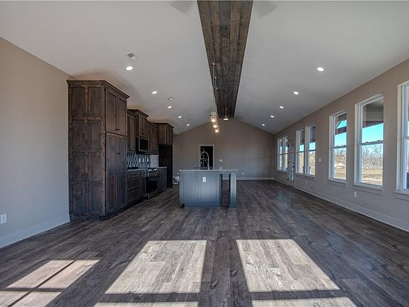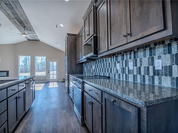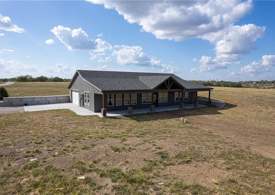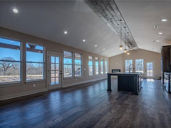 Your private oasis awaits. This brand new home sets far back off blacktop road and welcomes seclusion, peace, wildlife, sunrises and sunsets. Overlook approximately 4 wooded acres from front covered porch that spans the length of the home. Step into a bright and open living space that is great for entertaining with a massive Kitchen Island, pantry, ample cabinetry, and stainless appliances. Second living area could be formal dining, workspace, study, rec area, sitting room...the options are endless. Master bedroom is complimented with views of land and a huge walk in shower with dual shower heads, double vanity and walk in closet. All bedrooms have carpet. 7.5' two car garage door. Adequate space to build a shop/outbuilding, pond and garden. Close to town and schools and just a few minutes to 50 Hwy.