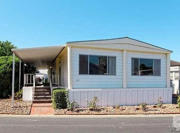 Very well maintained double wide mobile home located in a Senior Park. Two bedroom each has its own attached bath /two bath. Large living room, formal dining, spacious eat-in kitchen, family room. Home is equipped with earthquake braces, wheelchair ramp, 10 year old roof, newer deck. Most recent upgrades include new plumbing throughout home & hot water tank ($11,000) New central A/C and heat ($6000) new double pane slider to porch, New flooring in kitchen, family & guest bath, new washer/dryer included, new sidewalk, front of the home has been painted with new awnings, large side yard with fruit trees as well as a back patio. Home also incudes an evaporated cooler with a new motor. Located in an highly upgraded Senior Park with beautiful amenities. .