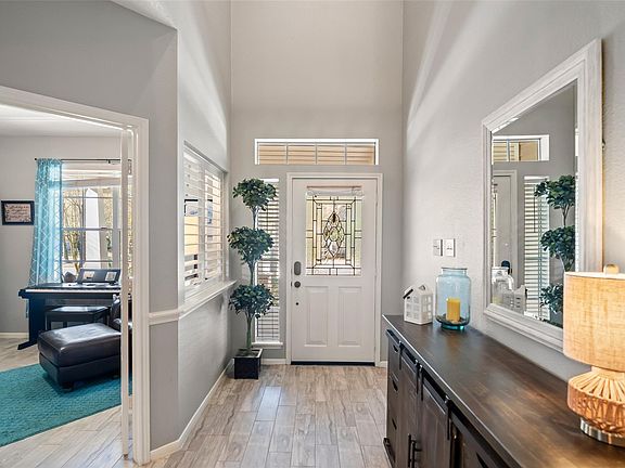 Tropical poolTranquil backyardFormal dining areaWood like tile floorsPrimary suite downCozy front porch