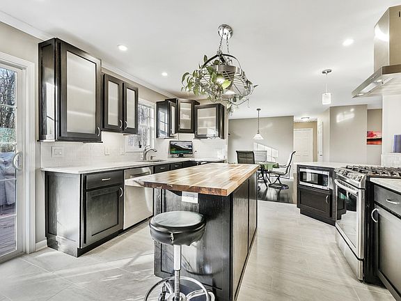 STUNNING UPDATED HOME WITH DREAM KITCHEN! Completely renovated 3 bed, 3 bath home. The sleek, high design kitchen features espresso cabinets w/frosted glass contrasts magnificently off of the white, granite countertops & white subway tile backsplash. Butcher block island, a gas range, a spacious deck for serving under the stars makes this a chef's dream. Gorgeous dark wood floors throughout. Living & dining rooms are open & bright! Hardwood floors continue through to master ensuite featuring gorgeous faux wood tile work in the shower & stone & wood accents around jacuzzi tub! PLUS RADIANT HEATED FLOORS! Two more spacious bedrooms & guest bath. Downstairs family room w/pellet stove, 2 more bonus rooms & mudroom! 2 car garage & great views! Walk-up attic! Whole house GENERATOR!