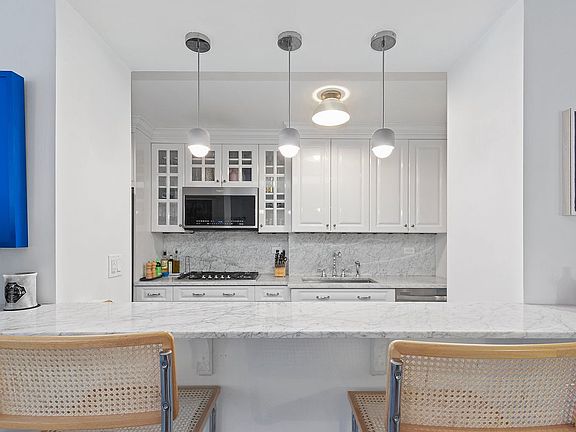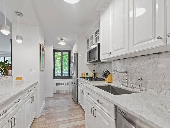 Nicely set off from the living space, the sunny bedroom has been skillfully divided to provide a second sleeping area or home office. There is ample closet space both here and in the apartment’s entry way, which features large closets on both sides. A bathroom clad in crisp, clean white marble caps off this lovely home.