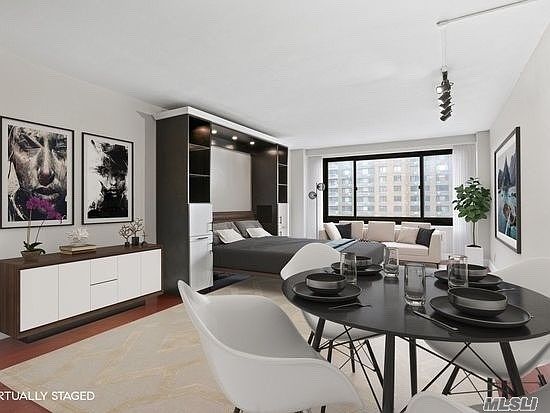 Resting on a high floor of a prime Clinton Hill elevator building, this spacious studio has been tastefully updated to suit your needs. The unit features a renovated open kitchen with crisp white cabinets, black granite countertops, stainless steel appliances, and a breakfast counter that opens to the living area. The roomy living area boasts a wall of windows with sweeping views of the Lower Manhattan skyline as well as a custom Murphy bed with clever storage. There is a dressing area or study with ample closet space and an updated bath with penny tiles. Glimmering hardwood floors are found throughout the apartment. Willoughby Walk is a fully-staffed and well-maintained post-war elevator building with 24-hour security, central laundry facilities, storage & bike storage (with waitlist), and parking (also on a lengthy waitlist). Pets are permitted with board approval.