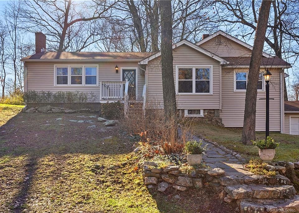Enjoy the conveniences and ease of one-floor living in this charming ranch-style home. The spacious living room features a floor-to-ceiling stone fireplace as its focal point and is filled with natural light. French doors from the living room to the rear deck are a dream for easy entertaining. Just a few steps down from the living room, the kitchen has a wonderful built-in breakfast bar and a generous pantry. The dining room is large, and light filled with lovely hardwood floors. Each of the 3 bedrooms also has hardwood floors. The primary bedroom has a large closet with built-ins. The smallest bedroom is perfect for and is currently being used as a home office. A walk-up attic has tons of space for all your storage needs. Pull right into the attached 2-car garage that offers even more storage space. This home sits on over an acre of property with mature plantings. A side yard has lovely raised beds for a vegetable or flower garden. Just off the rear deck, and down one terrace, there is a stone fireplace/grill that is perfect for outdoor entertaining. The picturesque backyard is huge and mostly level. Come enjoy life in this tranquil and natural setting with all the conveniences of town nearby. This a great opportunity to stop renting and enjoy owning your very own home!