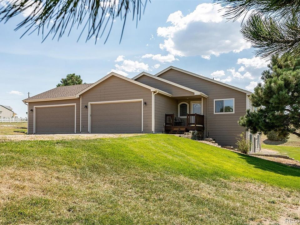 Beautiful ranch in rural Parker with big Rocky Mountain views! Country-quiet but city-close, only 15 minutes to Parker or Elizabeth! The main level features a spacious living/dining room with charming gas fireplace! A sunny kitchen is sure to delight the chef in the family with its plentiful cabinets and countertops, pantry for additional storage, eating space, and all appliances included! The master suite boasts a walk-in closet and a private 5-piece bath, and two secondary bedrooms share a full hall bath! The walkout basement has a large family/rec room with dry bar and bar fridge (bar area is plumbed for a sink), bedroom, office and a bonus room that would work well as a workout area! a 3rd bath in the basement is ready for completion - toilet is installed, finish the vanity and tub/shower to your liking! From the main level, step out to the deck - perfect for BBQs and get-togethers with family and friends! The 4-car attached garage is perfect for cars and your other toys, plus additional space for a workshop or man cave! The private well allows for up to 4 large animals! Cul-de-sac location = low traffic! Lovely, peaceful setting for enjoying Colorado sunsets with all the conveniences of the Towns of Parker and Elizabeth just 15 minutes away!