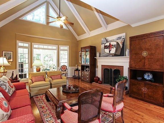 Master on the main! Fabulous brick home with 9 foot ceilings, gorgeous banquet size dining room, luxurious master bedrm and updated bath on main flr, 2 bedrms. and office upstairs ! Renovated kitchen with granite and new appliances, great room with wet bar, masonry f/p with gas logs, hardwood floors , large sunroom with Pella style windows opens to deck and wooded back yard. Office and two oversized bedrooms upstairs. Lots of great storage and two car garage. Neighborhood pool and lawn maintenance included in HOA fee. Tax record sq. ft. incorrect! 12/18/15