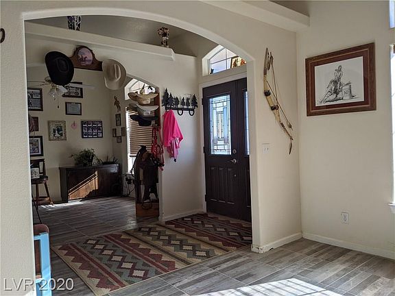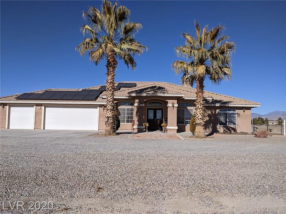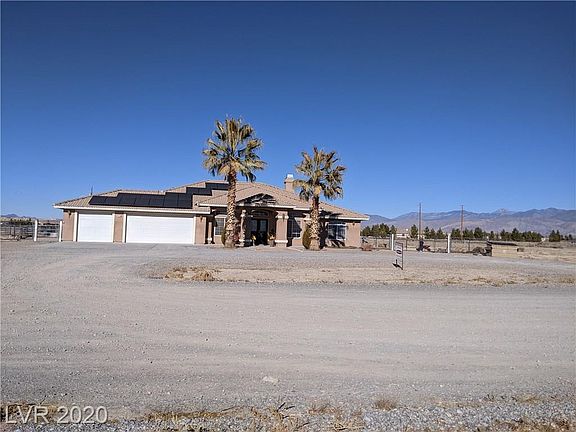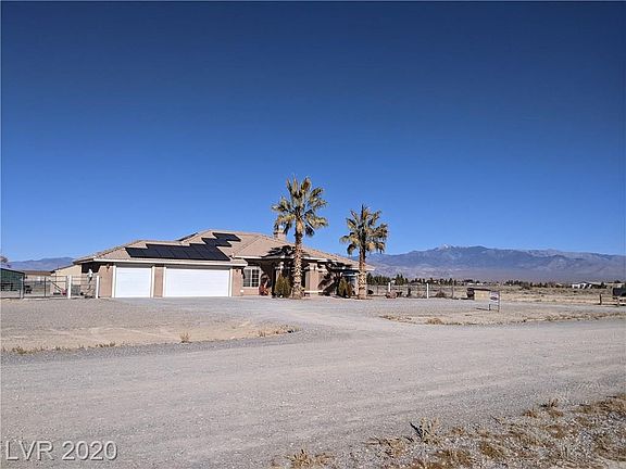 On over 2 acre lot , beautiful horse property in the south end of Pahrump NV. Two lots, two parcel numbers. Four stall barn with hay storage and tack shed, 5 stall carport (1 RV slot) 30x40 on a concrete pad. The 2nd lot is included in the sale, is fenced with chain link and includes an arena- some field fence in yard, light poles set (no lights) Double gate wide enough for RV and trailer. Custom home is 1959 sq.ft. 3 bdrm, 2 full bath with formal living and dining room, wood burning fireplace. Nice kitchen with a walk-in pantry and butcher block countertops. Solar panels. 3 car garage, covered patio and a fantastic view of Mount Charleston. Make an appointment soon, and come to see your new home.