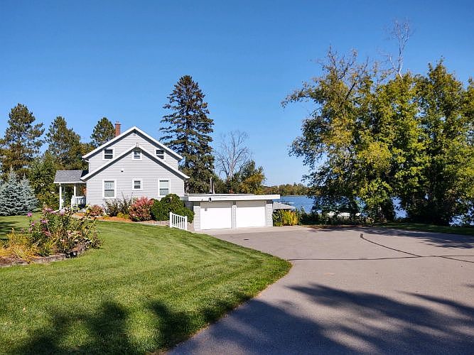 Extensively updated home and landscaping with an amazing view of Rice Lake and Mississippi River from this large lot with 306 of shoreline. Many updates in past 8 years including new shingles to be put on house and garages in Oct 2022. Updates include: Windows, steel siding, interior doors on main level, front door, 2 storm doors, lakeside screen doors and wrap-around UltraDeck, blown-in and batts insulation in attic, new blinds throughout, under-counter lights in kitchen, vanity, countertop, toilet and cabinet doors in main level bath, fireplace doors in LR. Range, refrigerator, furnace and AC in 2015, mini-split in upper-level bedroom. New washer in 2020. Microwave and dishwasher under 1 yr old. Asphalt driveway and irrigation system for entire yard installed in 2015. Heated insulated detached 26x32 garage plus attached 16x20 garage with newer cement floor. Solar tube skylights are in stairway and upper hallway for great lighting. Aprilaire humidifier. Knotty pine wall coverings in LL.