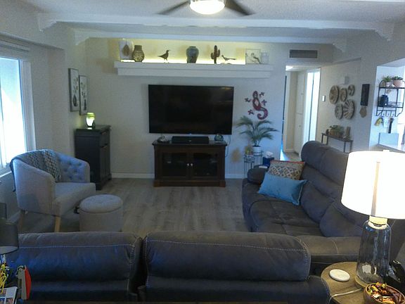 This beautifully updated condo features stylish plank flooring, quartz countertops, and a modern kitchen with a pub table. The living area is furnished with a sofa, loveseat, flat-panel TV, desk, and side chair for your comfort.