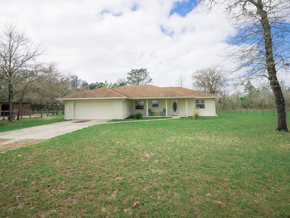 ENJOY GORGEOUS SUNRISES AND PEACEFUL COUNTRY LIVING! This 3/2 Concrete Block Stucco home boasts 1,436 Sq ft of living space, easy to maintain tile flooring, split bedroom floor plan, spacious screened rear porch, two car garage and a covered front porch great for watching the sunrise and the pretty view of the large cattle farm across the road. All this and more on a fenced and cross fenced 5 Acre corner parcel w/ a 2 stall run in style barn w/ feed & tack room. All this and more located in one of the most sought after neighborhoods in Levy County-- Steeplechase Farms-- a horse friendly community with deeded access to miles and miles of trails on the Goethe State Forest. Convenient to Williston, easy drive to Gainesville and/or Ocala for work or shopping. Minutes from HITS show grounds.