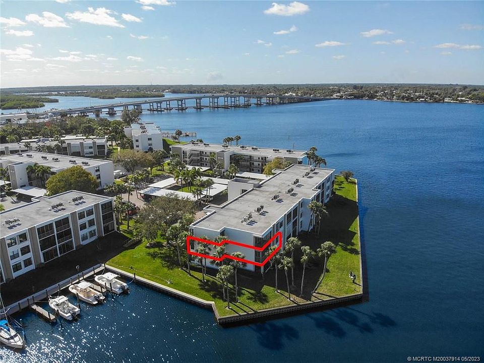 Spectacular wide river views and sunsets from this lovely 2 bedroom END-UNIT in a great riverfront boating community with DOCKAGE and OCEAN ACCESS! Largest (1300sq.ft.) and the most desired floor plan and location in the Circle Bay Yacht Club community. Light and bright end-unit with NORTHWEST river views, large spacious rooms, tile throughout & a great screened patio for morning coffee or afternoon cocktails. Magnificent river views from every room! Wonderful, active community that offers resort style amenities including heated pool, hot tub, sauna, marina, boardwalk, clubhouse, covered dining deck with outdoor kitchen & commercial style gas grills, bocci, shuffleboard, patio with fire pit, workshop & so much more! Walk, bike or cruise by boat to shopping, restaurants & charming downtown Stuart. Dockage available for $1.50/ft per month for boats up to 36ft. Enjoy the true Florida lifestyle! No pets, no pick-up trucks, no rentals 1st year, 55+ community.