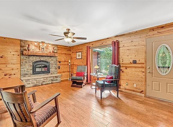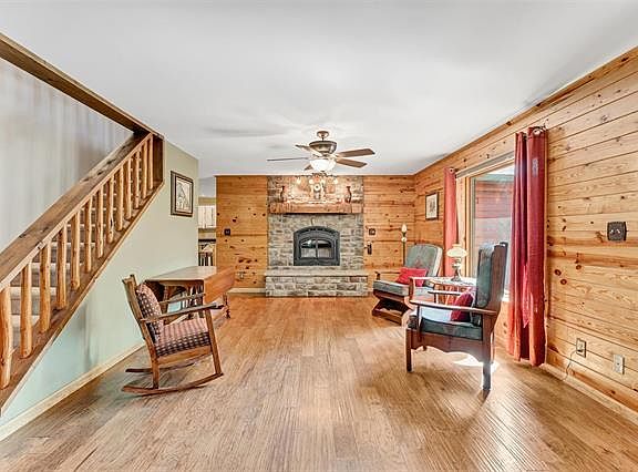 Still accepting offers on this house. If you are looking for country living, this is the perfect spot. The wood sided 2 story sits on 5 tranquil acres, with a screened in back porch, beautiful deck which includes a hot top and majestic views! The front porch opens into the open area of living and hearth room space. Notice the carvings in the mantel on the woodburning fireplace. The room is softened by engineered hardwoods. The kitchen is massive with quartz countertops and stainless appliances, which stay. There are two pantries and cabinets galore. The main floor bedroom is carpeted and the main bathroom has a jetted tub. A main floor laundry room also is used as a mud room. Upstairs is a smaller bedroom, which could also be used as an office. The master is massive, with a reading nook and attached full bath, also with a jetted tub. Downstairs is a huge family room, media room, and wet bar. Also there is a 3 acre community lake & pavilion. Perfect for entertaining. Paradise!!