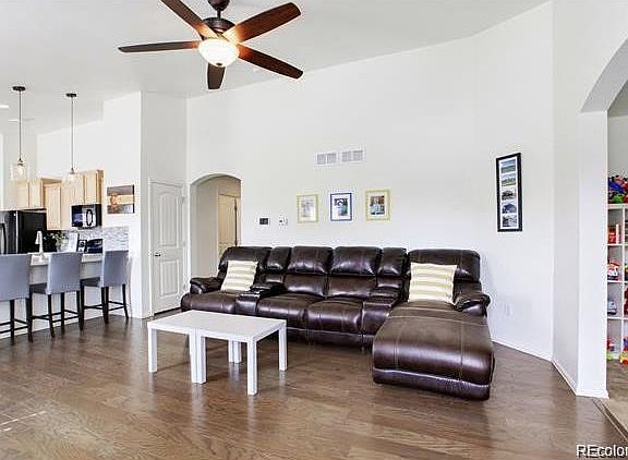 Property was under contract, over asking price & fell thru due to lack of education on solar lease! The 2 year old ranch home is located in a new neighborhood, in walking distance of a well maintained park, community pool, and is on a corner lot. As you walk into the front door from the covered front porch, which is big enough for a swing or furniture, you will be welcomed with an open space concept and hardwood floors. In the kitchen you will find granite counters and marble back splash, upgraded birch cabinets with pull out shelves in all of the lowers, a walk in pantry, large farmhouse sink, 3 rack dishwasher, and an island with more storage! Granite counters in the main floor bathrooms. An area for an office or formal dining also on the main floor. In the basement is a large recreation area and 2 larger bedrooms and more storage space! This property is near the new resort & convention center Gaylord at the Rockies, the light rail, and the new Panasonic Pena Station being built now.
