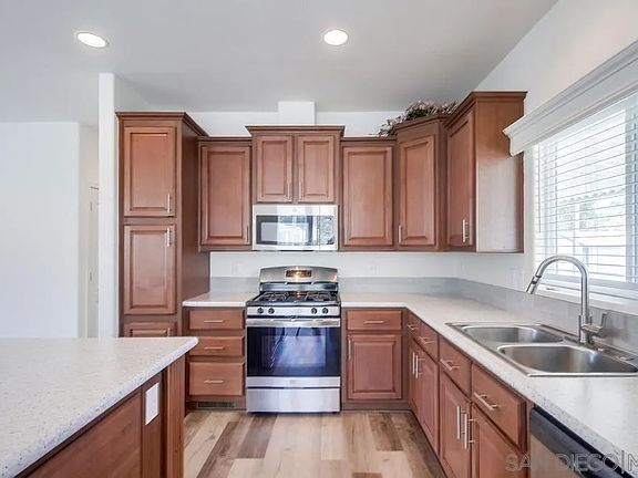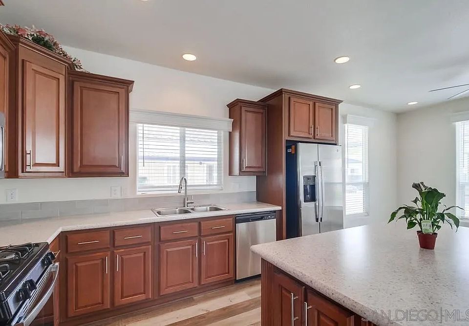 55+ Community. Open floor plan, vinyl wood flooring, and large windows throughout. High 9' flat ceilings. Central Heat & AC. Large kitchen w/center island, stainless steel appliances, large dining room & laundry room that fits full washer/dryer. Close beaches, downtown, and central San Diego.