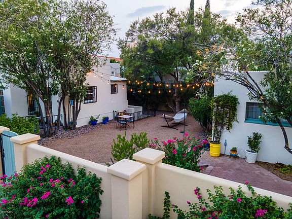 Welcome home to this exceptional 1,845 SqFt, three bed, 2 full bath modern double brick masonry stucco Art Deco Spanish Mission on private .17 acre premium corner lot in the desirable historic Olsens Addition neighborhood. Built in 1939 reportedly by the Mexican Consulate, walking distance to historic Arizona Inn, Banner Medical, the U of A, minutes to thriving downtown Tucson and quick access to I-10. Unique opportunity with vintage Art Deco character and charm with the convenience of updated professional designer amenities for those looking for modern multigenerational living, U of A, Banner Medical professionals, an Air B-n-B property, live in one & work/rent the other, seasonal visitors and investors alike! Rare property featuring finished basement den/bonus room with concrete CONT floors and mini-split HVAC, separate 545 SqFt guest house casita complete with kitchen, full bathroom, exposed brick 2 car 416 SqFt garage plus storage, brick paver driveway and additional off street parking. Exquisitely maintained single story split floor plan featuring: N/S orientation, original scored concrete floors, energy efficient Milgard dual pane low E windows throughout, alarm, security bars, interior freshly painted, updated kitchen with smart Wi-Fi enabled stainless steel gas range, exposed Blackbird Chic metal pipe shelving, refaced modern kitchen cabinets, hardware & fixtures, original marble counter tops, designer faucet, Crane vintage angle double sink with garden views, new subway backsplash, recessed lighting, gorgeous Waltham pendant copper light fixture, stainless steel fridge, walk in butler's pantry storage with interior stackable laundry. Formal dining area off kitchen with wood French doors to East patio, Echo 6 light bronze chandelier, rounded archway leads to cozy living room with hand carved exposed wood beam tall ceilings, abundance of natural light, built in alcoves, modern lighting, foyer and wood burning fireplace. Treat yourself with completely remodeled crisp white bathroom including herringbone floor to ceiling tiled wall, Aberdeen 48 inch vanity w/marble counter, Kensington pivot wall mirror, Manhattan vanity sconces, tiled floor, spacious walk in fully tiled shower w/Pfister fixtures, bench seating, thick full glass shower door and updated lighting. Enjoy tranquil outdoor living at its finest with private landscaped front and backyards featuring multiple patios, Catalina mountain views, 4 locking gates, mature vegetation on irrigation surrounded by thick masonry stucco courtyard walls. For those with distinctive and exquisite taste, this is a must see. Click on documents to view digitally measured floor plan, list of upgrades and improvements. Call to make your appointment to view this stunning home today.