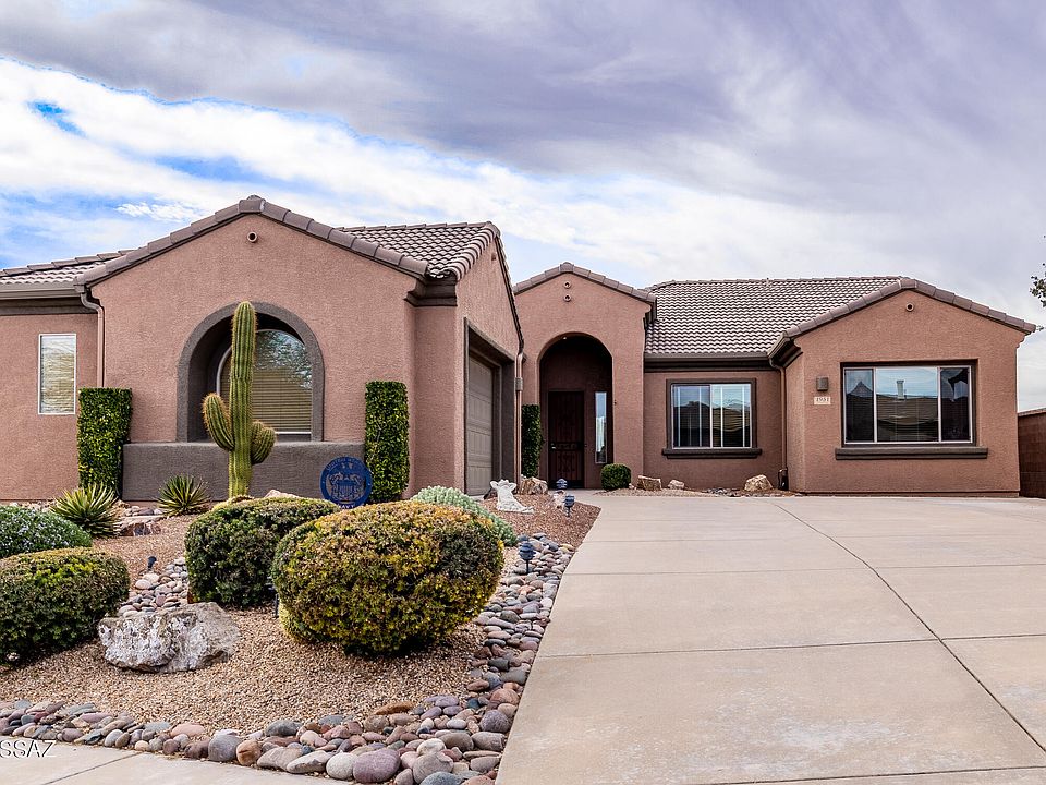 Luxury living at its finest w/unparalleled mountain & desert views! This gorgeous lot sites a 3 bed/3 bath w/owner ste & a jr. owner ste, making it perfect for short or long term guests. In addition, it has a flex rm that can function as an office/hobby rm. You'll love the high ceilings t'out. The home boasts a grand, covered entrance, great rm w/beautiful beehive gas fireplace, diagonal-set tile t'out (except bedrms). Kitchen has clerestory windows, brkfst bar, stainless steel appl, center island, granite cntrs, butlers area & breakfast nook! You'll love the gorgeous archways & recessed lighting t'out. Enjoy plenty of indoor/outdoor room for entertaining. The exterior has covered seating areas w/a pergola & patio, hot tub & pool w/waterfall. view fence & mature vegetation! WATCH VIDEO!!