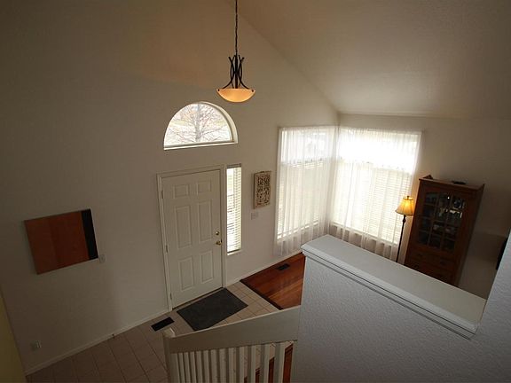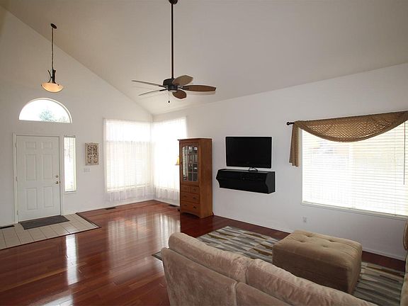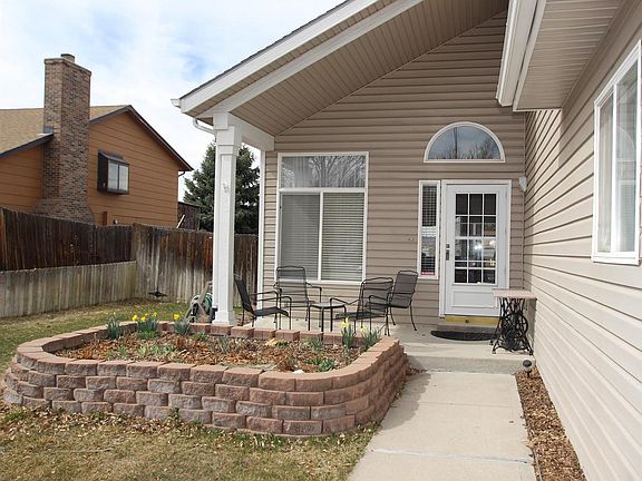 Fantastic corner lot with mountain views, vinyl siding, nice size covered front porch with screened front door, sprinkler system front & back located on cul de sac. Tile entryway & beautiful 4" plank brazilian cherry hardwood floors throughout great room & formal dining room with bay window. Soaring vaulted ceilings. Desirable new stainless steal appliances featuring a french door refrigerator with pullout bottom freezer & double oven with a 5 burner gas top. Large master suite with remodeled master bath offering a smooth solid surface countertop & walk-in shower complete with sitting bench & built-in shampoo shelf, designer tile floors & added linen cabinets for extra storage. Laundry room with storage cabinets. Oversized, drywalled & insulated garage. Screen door leads to backyard with extended concrete patio perfect for outdoor gatherings & dining along with privacy fence & 2 gates. Unfinished basement with rough-in plumbing for storage or future finished square footage.