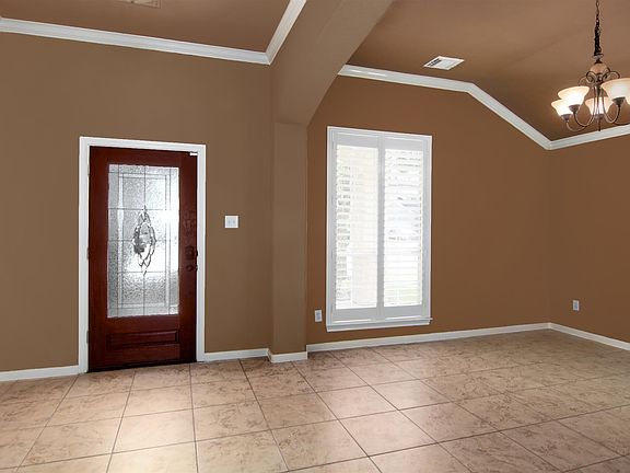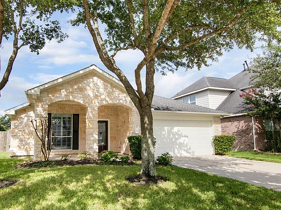 Immaculate & move-in ready on quiet cul-de-sac. Attractive 1 story home with covered front porch & stone facade. Lead glass front door leads to tile entry hall & living areas. Tile throughout with carpet only in 2 bedrooms. Formal dining room to left of entry hall leads to central kitchen via small hallway with double door pantry & utility room (washer/dryer incl). Island kitchen updated with Stainless steel appliances (all included), beautiful granite counters & tumbled stone backsplash. Double sink with oil-rubbed bronze hardware. Off the kitchen is a breakfast area & then the living room. Living room has gas fireplace, plantation shutters & surround sound. Primary Suite is located at the back of the house with wood-look tile, 2 walk-in closets, double sinks, separate spa garden tub & shower. Extended hallway creates study nook /play area near 2 secondary bedrooms & hall bathroom. Exterior is brick on 3 sides for easy maintenance. Extended back patio. Auto sprinkler system.