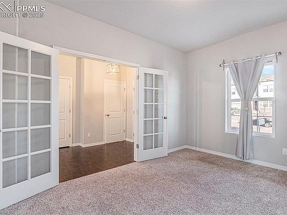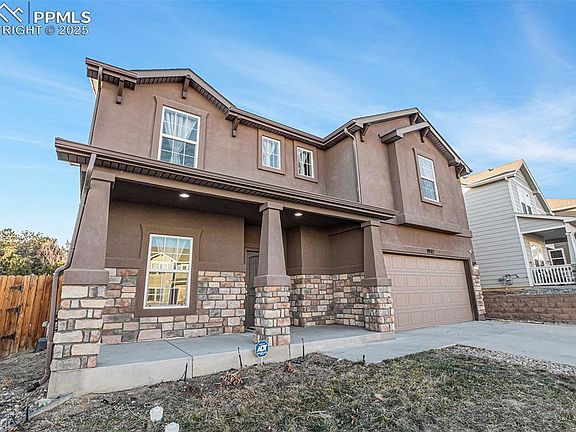 This stunning two-story Challenger-built home in Monument features a beautiful stone entry and a modern stucco exterior. Upon entering, a dedicated office space is located to the left, offering a quiet and functional workspace. The main floor also includes a convenient powder bath for guests. The bright and spacious living room boasts lots of windows, filling the space with natural sunlight and offering picturesque views of the lush green trees surrounding the property. An elegant arched entry leads to the gourmet kitchen, which is equipped with sleek stainless steel appliances and flows seamlessly into the breakfast nook, snug area, and formal dining room—perfect for gatherings and entertaining. Upstairs, a versatile loft provides additional living space, while the luxurious primary suite features a spa-like five-piece master bathroom for ultimate comfort and relaxation. The NEW CARPET has just been installed, matching the color of the master bedroom closet. The home includes a three-car attached tandem garage and sits on a private lot that backs to the tranquil Colorado Heights Camping Resort, a luxury RV park with no neighbors behind.. The spacious yard features a storage shed for added convenience. Blending style, comfort, and privacy, this home is truly a must-see!