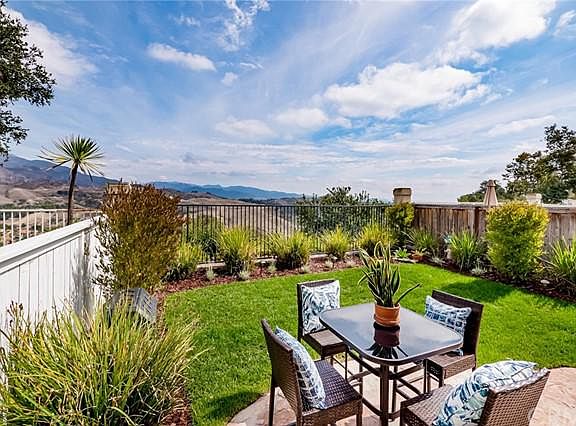 PANORAMIC VIEW! VIEW! VIEW!!..Wow this paired home has it all! As you walk in to this 3 bed 2.5 bath 1563 sq ft home you can't help but notice the high ceilings and all the beautiful natural light coming through the windows looking out to the amazing canyon view. The living room and dining room are model perfect and very spacious. There is a two sided fireplace that divides the living room and family room, this is a very open floorplan.. The upgraded kitchen has Delicatus granite counters stainless steel appliances and is open to family room. Once in the kitchen you will never want to leave because of your fabulous view of the Saddleback Mountains WOW WOW WOW..the view is priceless !!! There is an inside laundry and a downstairs bath with granite counters. Going upstairs you are greeted with a very spacious hallway that leads to 2 good size secondary bedrooms with a light and bright jack and jill bathroom with dual sinks and granite counters. Moving down the hall to the master bedroom you have another picture perfect view of the beautiful Saddleback mountains ...imagine waking up to that view every day !!!! WOW! The master bath has dual sinks, granite counters and a spacious closet. This home is model perfect and totally turn key. The HOA amenities include and Olympic size pool,spa, club house, gym, sand volleyball courts, tennis courts, play ground, bbq area and much more. Located close to award winning Portola Hills Elementary, Concourse Park and Whiting Ranch with all its many biking , hiking and running trails. Just minutes away from shopping and dining. With No MELLO ROOS and LOW TAXES, this home is the perfect fit.