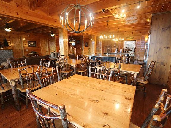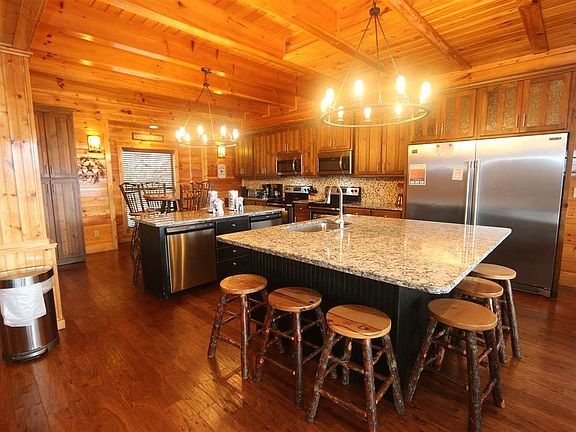 13 Bedroom, 11.5 bath investment cabin accommodates 58 guest. Located near Pigeon Forge. As you enter the main floor you see the open floor plan. The view of the mountains is breath taking. The living room and large sofas located around the fireplace and huge flat screen TV. The kitchen has 2 granite topped islands with 2 dishwashers and bar stools for seating. The kitchen is supplied with 2 ovens, 2 microhoods, and a large side by side frig/freezer. There are 2 master bedrooms on the main floor. Upstairs has 5 bedrooms and a bunkhouse room. There are games and a loft. Downstairs opens into the room with a pool table and theater seating for the 72 inch flat screen TV with surround sound. Out on the deck you find 2 large hot tubs, where you can soak and enjoy the view of the mountains. Some owner financing is available.