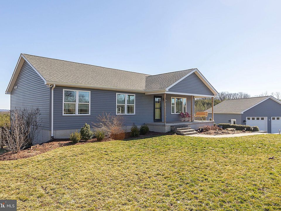 Country living so picture perfect and just enough without being too much! Fabulous wide open sun filled kitchen accented by wood floors, cathedral ceiling, modern lighting, stunning center granite island, and a decorative stone floor to ceiling fireplace. Ideal bedroom sizes and primary has the sought after tiled spacious shower, and then step out onto your massive composite deck with breathless views of the mountains and neighboring pasture. Basement is set for entertaining for friends and family and if you want to engage in you daily workout routine! Finish up your workshop projects in the oversized detached two car garage and all this on an acre plot of land!