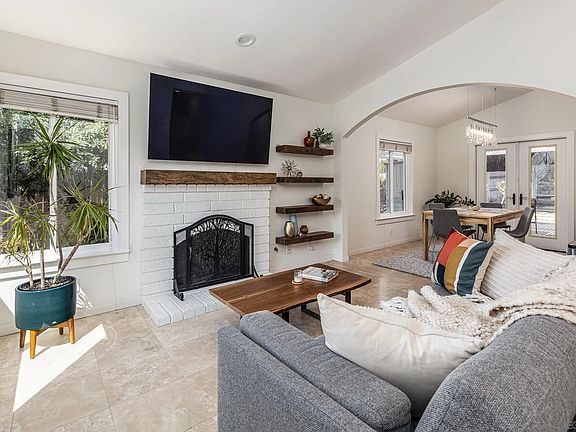 Welcome to your new oasis of charm and comfort! This home boasts exceptional curb appeal, starting with a spacious front yard adorned with mature palm trees that greet you as you approach via the inviting brick steps and walkway. The front door, accented by a stunning stained glass sidelight, opens to reveal a living room bathed in natural light from large windows, featuring arched doorways and open, natural wood shelves complementing a cozy fireplace.