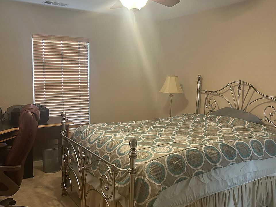 Furnished queen-sized bedroom with large closet and private bathroom. House is set off the street in a quiet neighborhood, but very close to stores and restaurants. Washer/dryer and large backyard. Storage space in garage if needed. Off-street parking. Month to month lease. Utilities/wi-fi included.